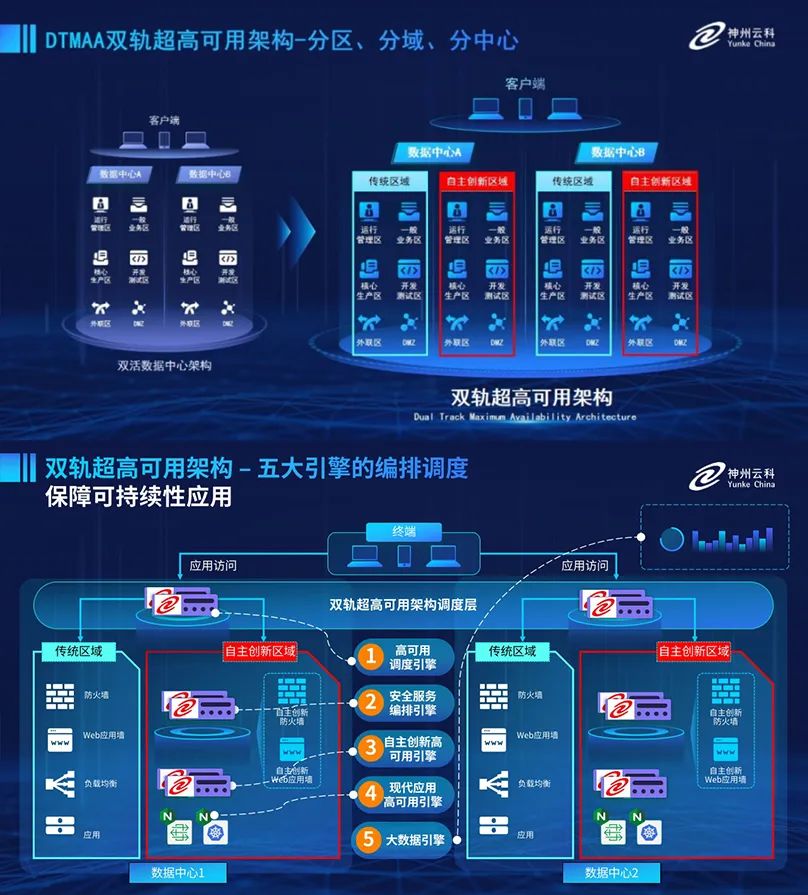 为助力银行业务高质量发展,更好地应对数字经济时代对可持续性的高要求,实现“信创”与“数字化”齐头并进,金年会jinnian创新性的推出了双轨超高可用架构。该架构在双活数据中心的分区调度基础上,增加信创域和非信创域的分域调度,实行信创域与传统域应用全量部署,使双中心运营变为双中心四区域并行运行,互为多活,将“0到1”的单轨建设道路变为分区分域协同的多活双轨超高可用架构。帮助客户在新架构下,保障“信创”的同时解决性能瓶颈,提升稳定性,保证应用可持续性,最终实现信创区域和非信创区域的平滑过渡,完成国产化替代目标。