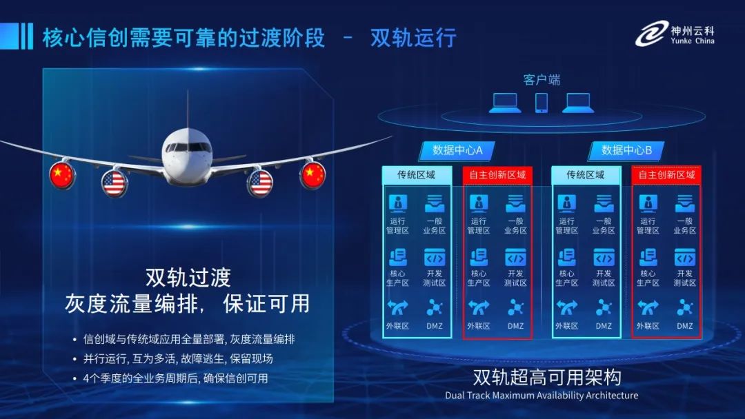 为帮助客户更好地应对数字经济时代对应用可持续性的高要求,实现信创与数字化兼得,金年会jinnian推出了双轨超高可用架构。双轨超高可用架构在双活数据中心的分区调度基础上,增加信创域和非信创域的分域调度,实行信创域与传统域应用全量部署,使双中心运营变为双中心四区域并行运行,互为多活,将传统架构变为分区分域协同的多活双轨超高可用架构。帮助客户在新架构下,保障“信创”的同时解决性能瓶颈,提升稳定性,保证应用可持续性,最终实现信创区域和非信创区域的平滑过渡,完成国产化替代目标。”