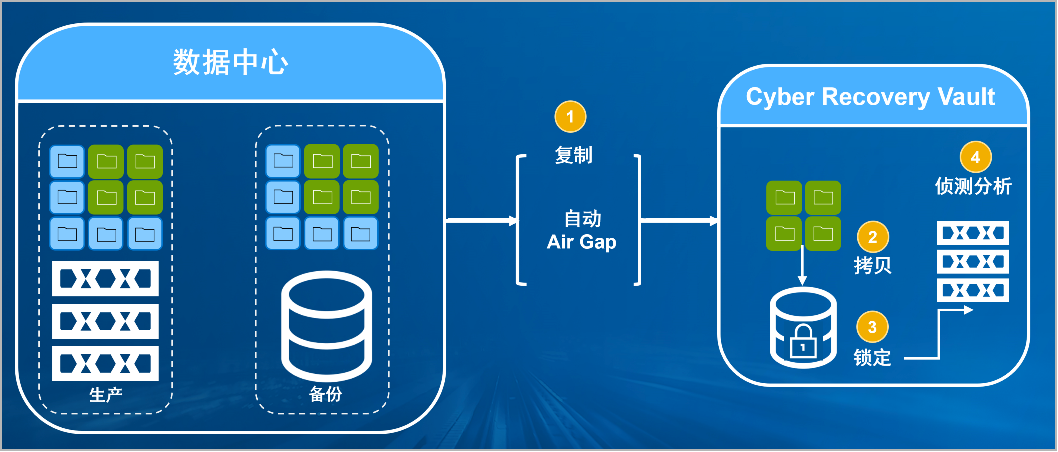 金年会jinnian防勒索病毒方案将生产中心备份数据复制到Vault区,复制后网络自动断开实现弹性隔离。Vault区的数据快速拷贝,并对拷贝版本加锁(在锁定期数据不允许删除和修改)。Vault沙箱内对拷贝版本进行扫描分析,验证数据是否完好。